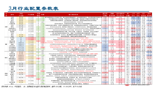 综上所述,整体而言,展望3月,预计两会期间市场仍将保持稳定,后续市场有望延续两会政策指引做出一定选择。若两会政策超预期,政策相关方向有望迎来较好表现,若两会整体延续前期维稳风格,我们预计科技自身产业周期表现仍将持续,产业链细分发展方向或产生轮动。3月行业配置我们建议围绕2条主线进行,一条两会政策有望进一步推进的方向,包括顺周期、消费等,另一条建议持续关注高景气度趋势已经明显逐步落地的泛科技板块,光伏、军工等低位制造业也有望迎来反弹,但行业中长期增速仍有不确定性,排序靠后。