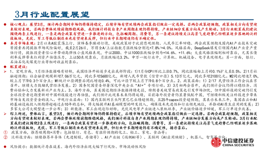 展望3月,预计两会期间市场仍将保持稳定,后续市场有望延续两会政策指引做出一定选择。若两会政策超预期,政策相关方向有望迎来较好表现,若两会整体延续前期维稳风格,我们预计科技自身产业周期表现仍将持续,产业链细分发展方向或产生轮动。3月行业配置我们建议围绕两条主线进行,一条是两会政策有望进一步推进的方向,包括顺周期、消费等,另一条建议持续关注高景气度趋势已经明显逐步落地的泛科技板块,光伏、军工等低位制造业也有望迎来反弹,但行业中长期增速仍有不确定性。