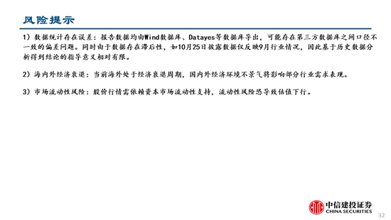 1)数据统计存在误差:报告数据均由Wind数据库、Datayes等数据库导出,可能存在第三方数据库之间口径不一致的偏差问题。同时由于数据存在滞后性,如10月25日披露数据仅反映9月行业情况,因此基于历史数据分析得到结论的指导意义相对有限。
